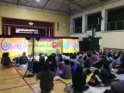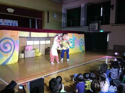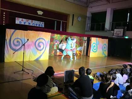 11月17日(土)10時30分より,上鳥羽学区子育て支援ステーションの方々による催しが,上鳥羽小学校体育館で開催されました。今年は,劇団バクによる人形劇「ねずみのすもう」でした。上鳥羽学区にお住まいの,小さな子どもたちや保護者の方々,上鳥羽保育園・村山保育園・山ノ本保育園の園児,中唐戸児童館・山ノ本児童館の子どもたちをはじめ,上鳥羽小学校の児童が参加しました。