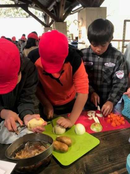 楽しみにしていた活動の一つ,野外炊事。みんなで協力してカレーを作ります。自分の役割をしっかり果たし,おいしいカレーを作ります!