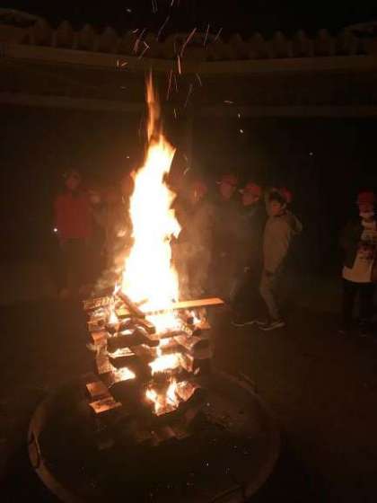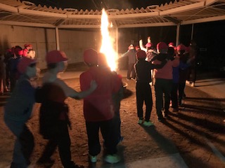楽しみにしていたキャンプファイヤーです。外は寒いですが,大きなファイヤーの炎を囲むととてもあたたかい雰囲気になりました。係の子どもたちが中心になって進行し,キャンプファイヤーをみんなで楽しみました。
