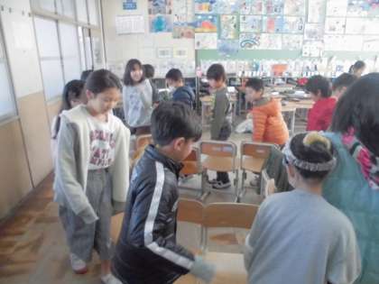 パーティー係さんの企画で中間休みに椅子取りゲームをおこないました。1〜4班と5〜8班の2チームに分かれておこないました。真剣にいすに座る子どもたちの姿が見られました。ドキドキの中間休みで楽しかったです!