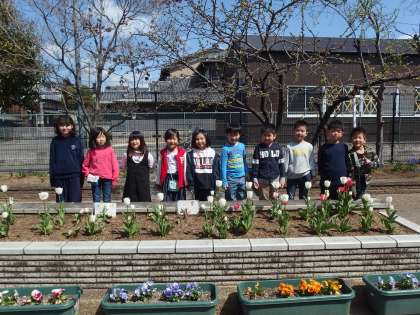 お花の前でみんなで写真を撮りました。