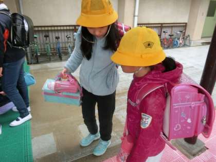 1年生に靴箱の使い方,かさのしまい方を伝えています。
