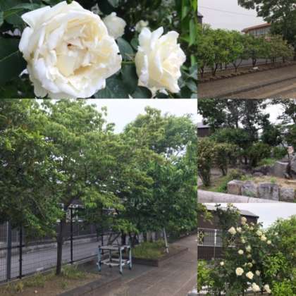 校門付近の木々は,みずみずしい緑色。昨年の台風で被害を受けた木々たちは,見事に復活し鮮やかな緑色の葉を茂らせています。バラの木も,今までにないほど花を咲かせています。これも,栽培委員会や管理用務員さんなど多くの人たちの愛情のおかげです。本当にありがとうございます。「卒業した6年生,心配してくれていた木々はもう大丈夫ですよ。」
