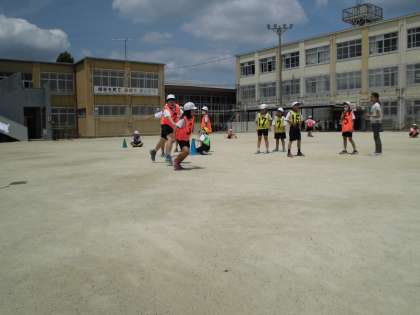 リレーの学習では,バトンパスや走順を工夫しながら行っています。毎回タイムを計りながら,チームで相談して取り組んでいます。