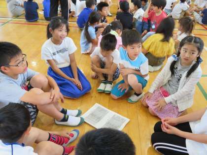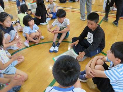 一年生をむかえる会では,たてわりごとに分かれて,自己紹介やゲームをしました。楽しい時間を過ごしました。