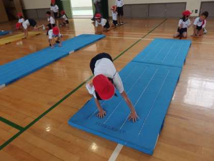 2年生では,前転,後転,側転,とび前転に挑戦します。