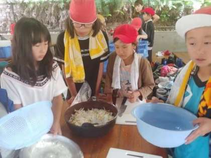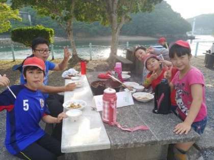 夕食は、野外炊事で「すきやき風煮」を作りました。班のみんなで協力して、野菜を洗ったり、切ったりしました。とてもおいしくできました。おなか一杯いただきました。