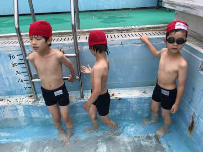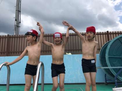 今日から,楽しみにしていた水遊びがはじまりました。今日は今年度はじめてだったので,電車ごっこやワニ歩きなどをしました。「さむいけど楽しい!」という声があがっていました。バディーの確認もしました。