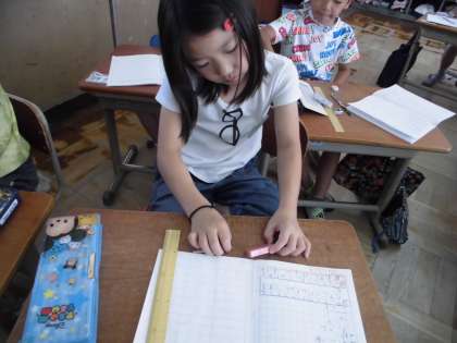 予想することで,長さの感覚が身につくといいなと思います。直線を描くのも,測るのも30cmものさしでがんばっています。