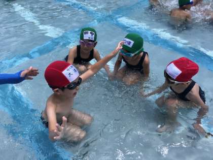 先生が話しているときは,水の中でも静かに聞きます。