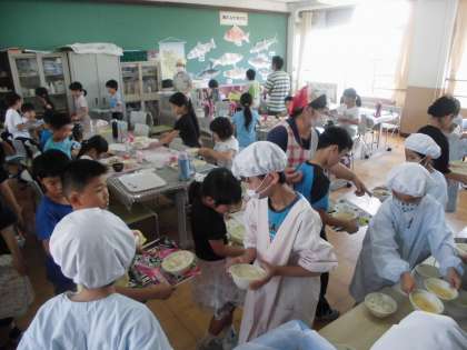合同ランチルーム給食は,初の試みです。今年度は,普段授業での交流がない学年と一緒時給食を食べる日があります。今日は3-1と食べました。