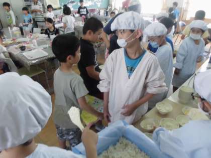 6年生が,3年生と一緒に当番をしてくれました。ランチルームでは,おぼんを持って並び,当番が置いていきます。