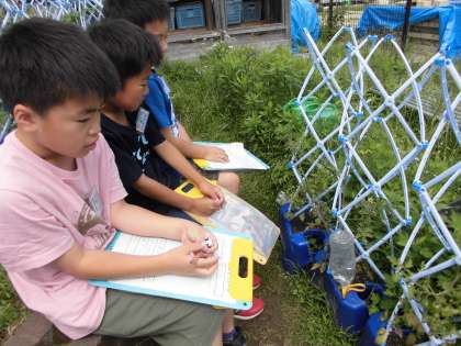 今日は,気温が低くて体育の水あそびが中止となりました。残念でしたが,その時間にミニトマトの様子を見に行きました。前と比べて大きくなったり,実が増えたりしていいました。早く大きくならないかな。