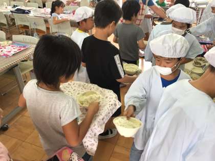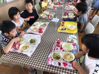 第2回の合同ランチルーム給食は,3-2とでした。4年生が,3年生と一緒に当番をしました。3-2の子どもたちは,4くみの子どもにたくさん質問をしてくれました。