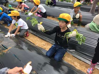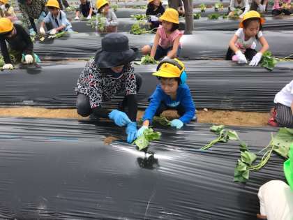 地域の方にお話を聞いてから,サツマイモの苗を植えました。4くみのはたけでも植えている子どもたち。「やったことある!」と張り切っていました。