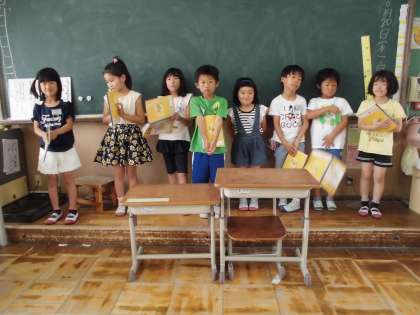 国語科「こんなものみつけたよ」の学習では,自分が見たものや聞いた音,嗅いだにおいなど,身近な発見の中で友達に伝えたいことを原稿用紙に書いて交流する学習をしています。校区探検でみつけたものやいつも行く近所の公園やお店など,「伝えたい!」と思ったことを文に表しています。文章を書くときは,組立を考えながら書いています。上手に書けた友達に発表してもらいました。お話を聞くみんなも真剣です。
