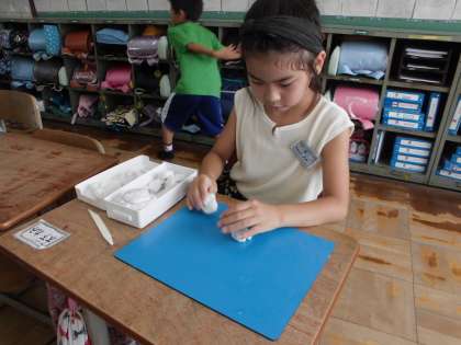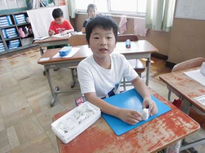 休み時間には,昨日学習したねん土の学習を引き続き楽しむ子がたくさんいます。梅雨の時期で外で遊ぶことができない日にも教室のあそびの楽しみが出来ました。