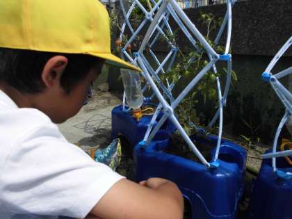 大事に育てているミニトマトがオレンジ色になってきて,みんなで喜びました。大事に育てていても,それぞれ育ち方が違います。今日初めて実ができたお友達には「おめでとう。」と言って喜び合いました。
