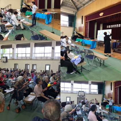 続いて,音楽療法士の坂下先生による「介護予防のための音楽療法講座」が行われました。発声練習や,手や楽器を使いながら歌を歌いました。先生のすてきなトークで,会場はとても和やかになりました。また,参加された方々も,声を合わせて歌ったおかげで気分が爽快になったとおっしゃってました。坂下先生,本当にありがとうございました。