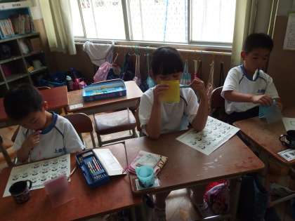 カラーテスターを使って,染め出した歯を見て,驚いたり,上手に磨けているんだなと思ったり,様々な感想をもった子どもたちです。
