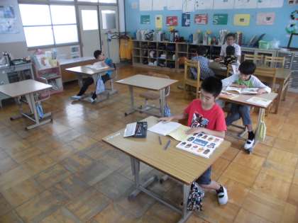グループに分かれて,時間を区切って個別の課題に取り組んでいます。音読をするグループ,聞いた言葉を書くグループ,静かに読書をするグループにわかれて,時間が来たら交代します。新しい取り組みですが,子どもたちに感想を聞くと,「楽しく学習ができた」と発表していました。