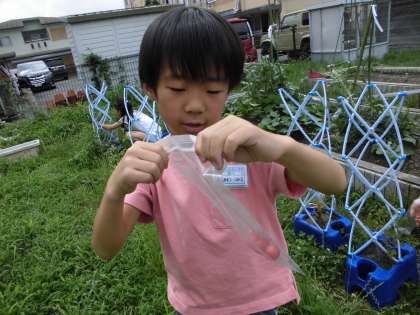 生活科で大切に育てているミニトマトが収穫できるようになってきました。苗から育てている子どもたちにとって緑から黄色,オレンジから赤色と色が変わっていくことはすごい発見です。「オレンジ色だったから,もう少し!。」と赤くなることを楽しみにしている子もいました。家族にプレゼントするのだと大変楽しみに持ち帰る子もいます。赤くなった実は早く収穫しないと,鳥に狙われたり,割れてしまったりすることも観察から学び,毎日様子を見に行っています。