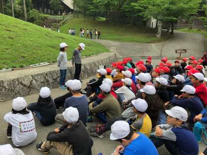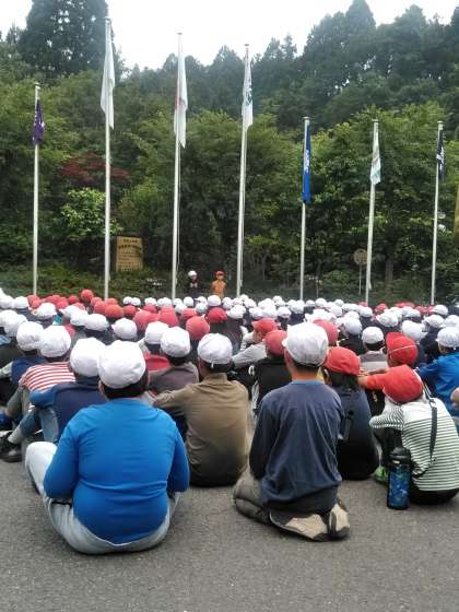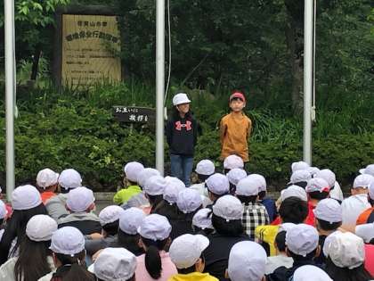 宿泊活動が一緒になった学校と合同で朝のつどいを行いました。学校紹介もみんなの前でしっかりお話できました。