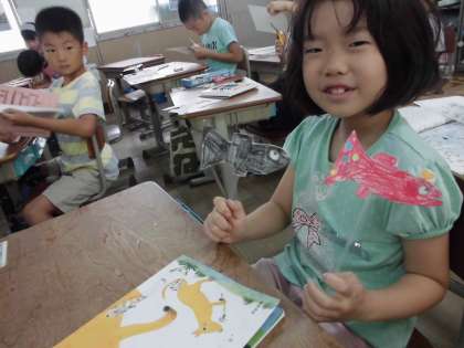 スイミーの学習では,お話の出来事やスイミーのセリフから学習をすすめています。今日はスイミーと小さな赤い兄弟たちを作りました。自分だけの魚になるように工夫をしました。