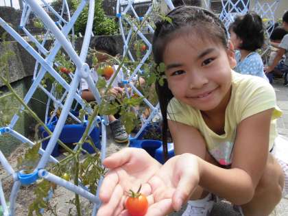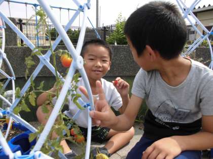 がんばって育てたミニトマトのかんさつのふりかえりをしています。どのように育ったのか,ミニトマト博士になれるようにじっくり観察してきました。