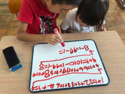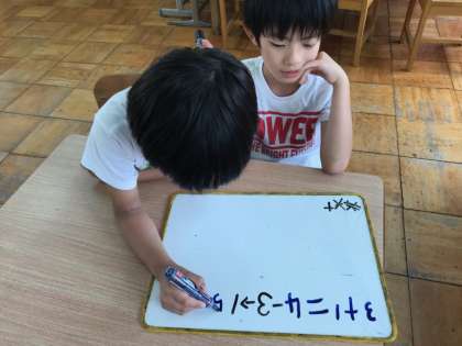 最近,4くみでは「計算しりとり」に頑張って取り組んでいます。前の人が出した答えから,「+,−,×,÷」と数字,答えまでを出します。自分が解ける問題,次の人が困らない答えを考えて計算しりとりをします。今日は,2人グループで取り組みました。