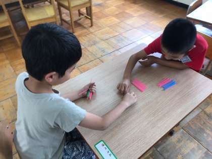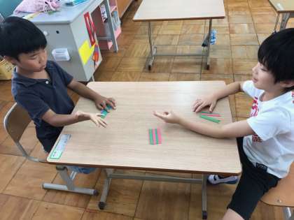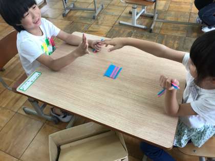 かぞえぼうをつかって,ぼう取りゲームをしました。じゃんけんをして,パーで勝ったら5本,チョキで勝ったら3本,グーで勝ったら1本取ります。最後に,何本あるか数えてだれが1番多いかを考えました。たくさんのぼうを数えるときは,10ずつまとめると数えやすいことがわかりました。