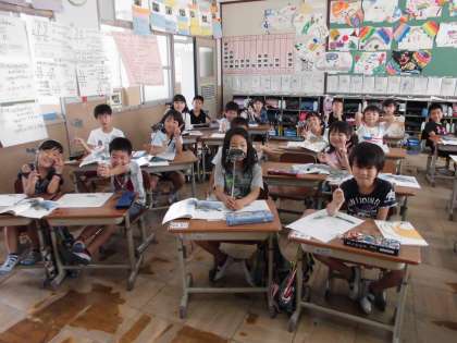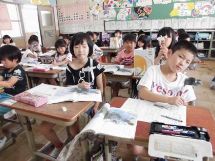 国語科では,どの子も主人公であるスイミーに思いを寄せて学習しています。スイミーの気持ちを場面ごとに考え,感想をもち,発表したり,スイミーがどんな魚なのか考えたりしながら学習しています。