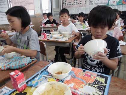 夏らしいおいしいメニューが給食では出ています。どの子もたくさん食べることでお昼からも頑張るパワーにしています。