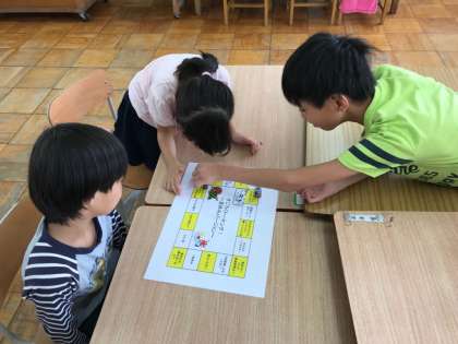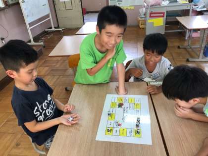 「右となりの人とじゃんけん!勝ったらもう1回」というマスもあります。「2学期にがんばりたいことは?」→「運動会」「国語」と,たくさんお話ができました。