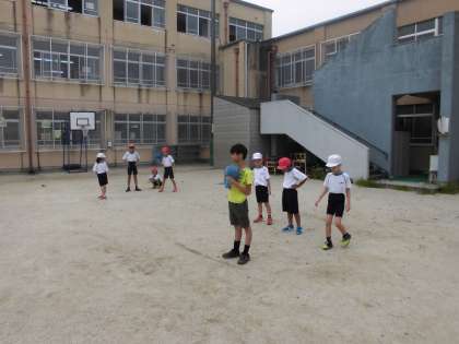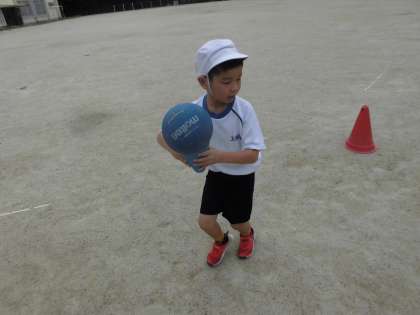 今日は久しぶりの4くみ体育をしました。コーンを裏返してボールを置き,落ちないように走ります。