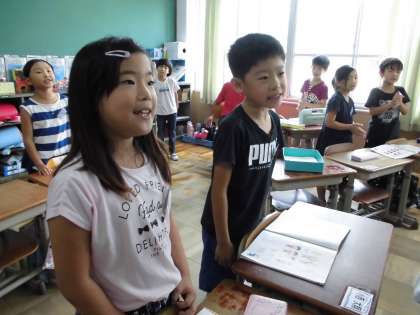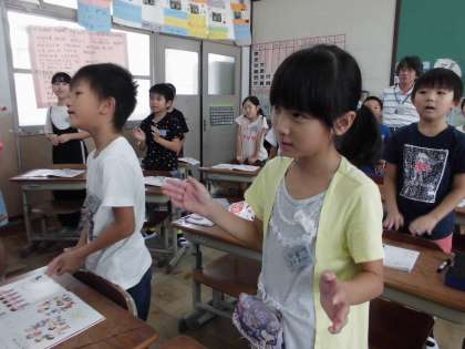 音楽の学習では,2拍子のリズムを感じながら,歌を歌ったり,楽器を演奏したりします。体もつかってリズムをとると,ずれないことや友達と合わせようと周りの音をよく聞くことが大切だと気づくことができました。