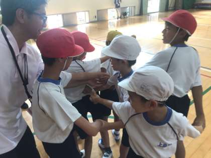 4人バージョンの後,8人バージョンをしました。手を離してはいけないので,声をかけ当て解きます。見事円になれたときはとびがって喜んでいました。