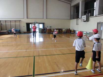 人間知恵の輪のあとは,ボール運びリレーをしました。これまでの体育で何度かやっているのでどんどん上手になってきました。