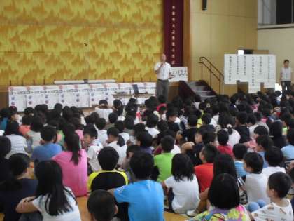 全校児童が体育館で集まって指導していただきました。
