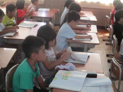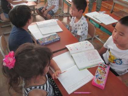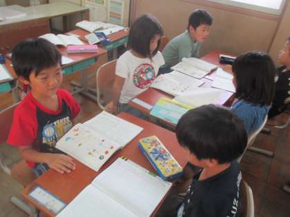 国語では「ゆうやけ」の物語を読み進めたり,「ひらがな あつまれ」で言葉をつなげたりしました。