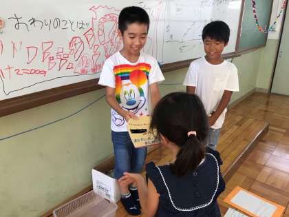 はじめの言葉や,司会の言葉,おわりの言葉も子どもたちが自分で考えて原稿に書きました。おわりの言葉では,4年生が音楽で学習した「ハッピーバースデー」をリコーダーで演奏してくれました。
