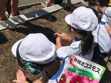 交流学年のみんなと一緒に,コスモスの種植えを行いました。校門付近なので,毎日通る場所です。咲くのが楽しみですね。