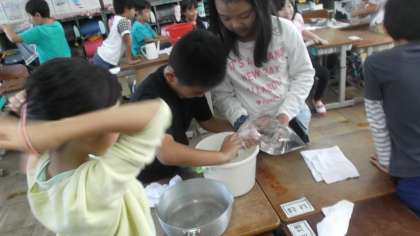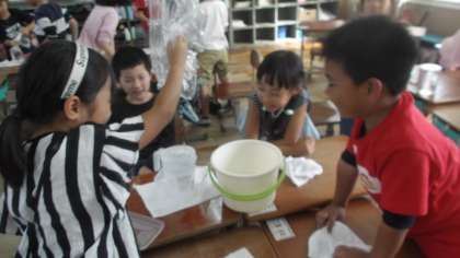 水のかさの学習では,さまざまな容器のかさを予想して調べる学習をしました。