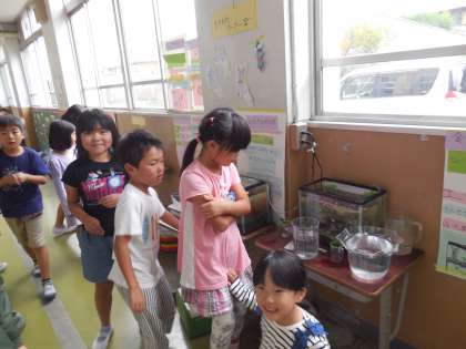 今日は1年生が2年生の教室前の「生きものコーナー」に遊びに来てくれました。