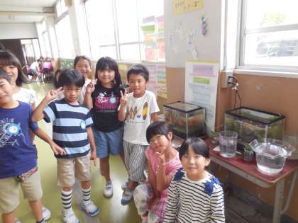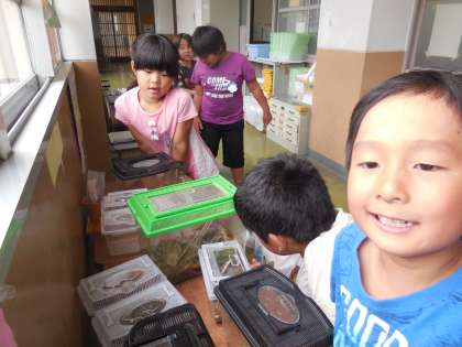 「このクワガタ,かっこいい。」「メダカがたくさんいる。」「数が多くて数えられないよ。」と感想を言いながら楽しんでくれる姿が嬉しい2年生です。