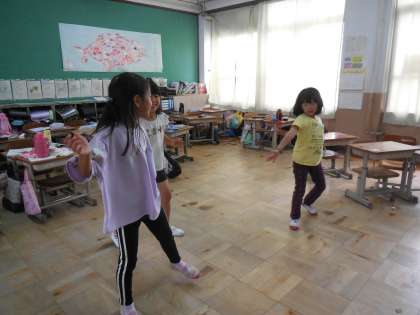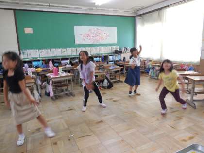 教室では全校体操で踊る「TWICE」の「happyhappy」を教室で踊っています。難しいダンスですが,あっという間に覚えられる2年生♪さすがです。
