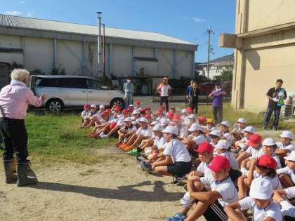5年生で育てているもち米が大きく成長しました。9日(水)は稲刈りを行いました。今回の稲刈りは手作業です。かまを使って,一つ一つ丁寧に刈っていきました。