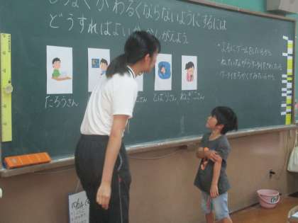 養護教諭の実習生の播間先生が,1年生に視力が下がらないようにするにはどうすればよいのかを授業で教えてくれました。挿絵を見ながら,「暗い部屋でスマホを見たらよくない」「ゲームやスマホに顔を近づけすぎたらいけない」などを考えることができました。