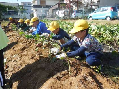 「さつまいもの先が土から見えているよ!」「本当に大きなお芋があるのかな。」いろんな気持ちで土をほっていきます。