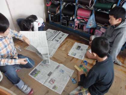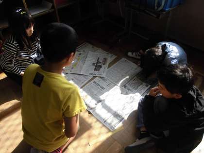 新聞紙で1平方メートルの大きさになる正方形を作って1平方メートルの広さを調べたり,様々な場所の広さを調べたり比べたりしました。